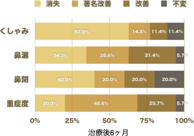 下の棒グラフによる「改善感」の変化を見ても「鼻閉」の改善感が維持されていることがわかります。もちろん「くしゃみ」、「はなみず」の治療効果も十分期待できます。