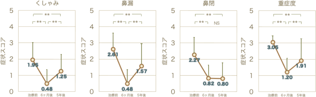 このグラフからは手術後5年で「くしゃみ」、「鼻漏(はなみず)」は手術直後より悪くはなっていますが、手術前の状態より重症度が低いことがわかります。また「鼻閉(はなづまり)」に関しては、手術後5年が経過しても、効果が維持されていることを示しています。以前は手術後数年で元に戻ってしまうと言われていましたが、結構効果が長く持続することがわかります。