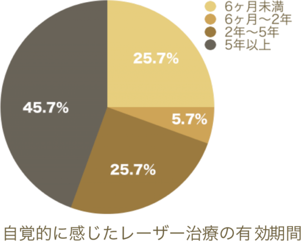 次の円グラフは、同じ論文の中に書かれている「患者さんが感じておられる効果持続期間」を表したもので、多くの患者さんが5年以上の効果持続期間を感じておられることがわかります。